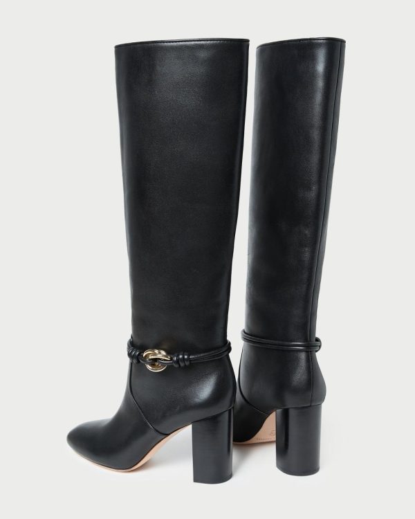 High-heeled, tall-shaft boot in black vachetta leather. Features a leather ankle wrap fastened with twisted gold hardware, an almond toe, and a padded footbed with gold stamped logo. Pulls on. 3.5-inch heel.