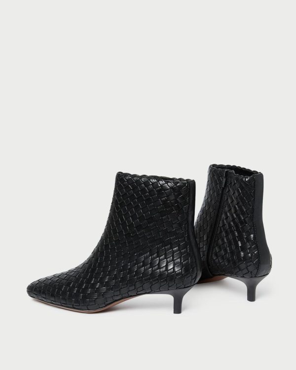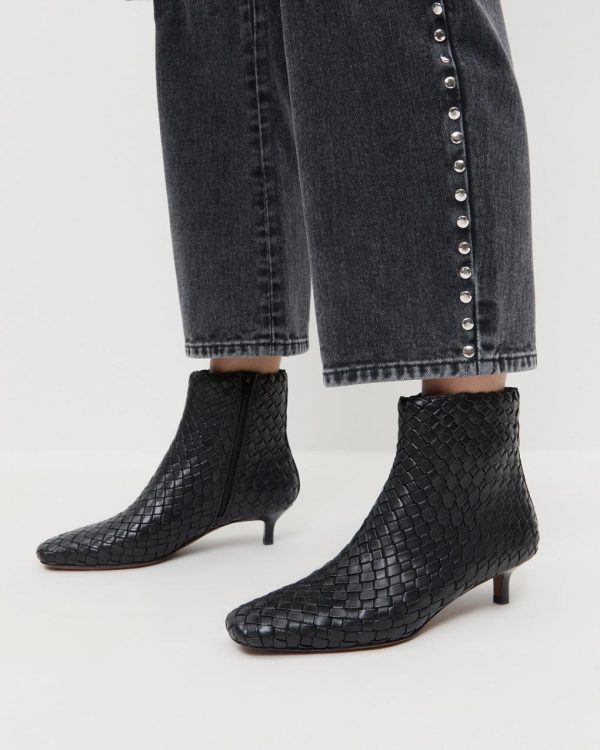 Skinny ankle boot in black woven leather. Features a padded leather footbed with gold stamped logo, a comfortable kitten heel, an elongated squared toe, and a concealed zipper closure. 1.5-inch heel.