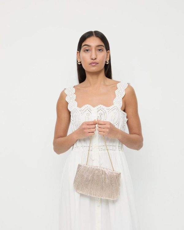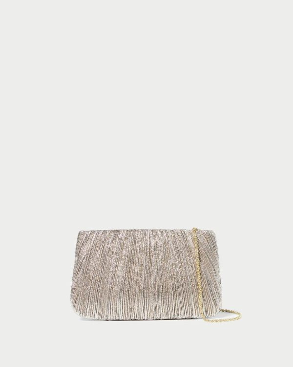 Flat pleated pouch in champagne-hued Italian lamé. Features a removable twisted gold metal chain strap, frame closure, full lining, and interior card slot.
