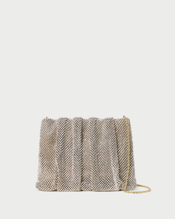 Gathered flat clutch in gold diamanté mesh. Features a removable twisted gold metal chain strap, frame closure, full lining, and an interior pocket.