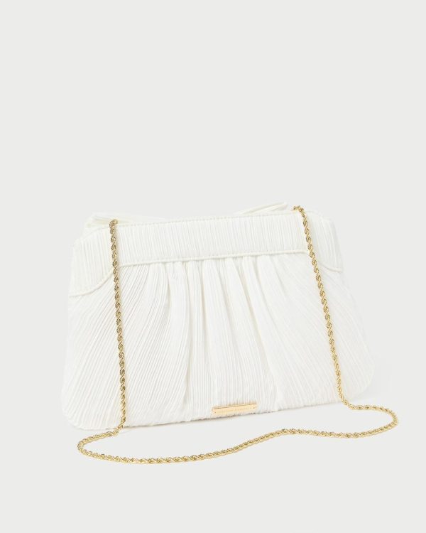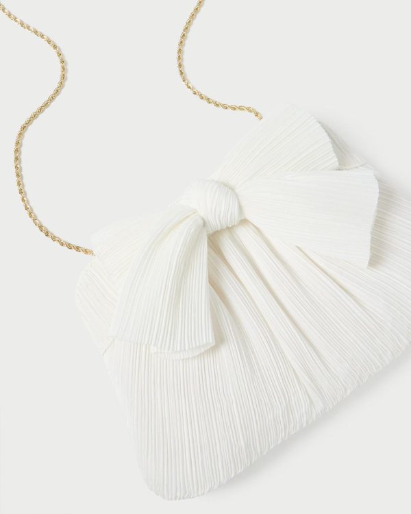 Pleated frame clutch in bright white shantung topped with our signature knotted bow. Features a removable twisted gold chain crossbody strap, frame closure, full lining, and gold stamped logo.