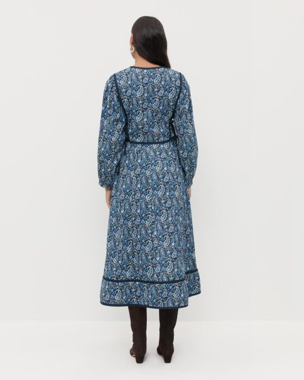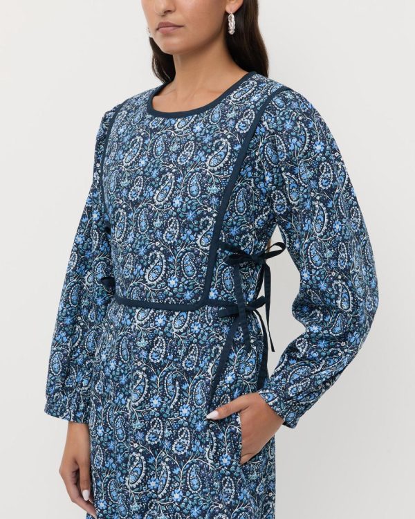 Midi dress in blue paisley floral cotton. Features a crew neckline, quilted detailing at the bodice and hem, balloon sleeves, and ties at the waist for a flattering fit.