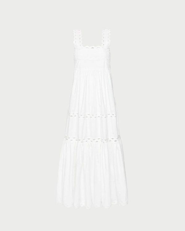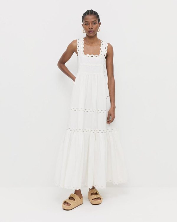 Sleeveless maxi dress in white poplin with a tonal ric-rac trim. Features a full lining and an elastic panel at the back for a snug, comfortable fit. Slips on.