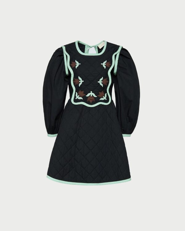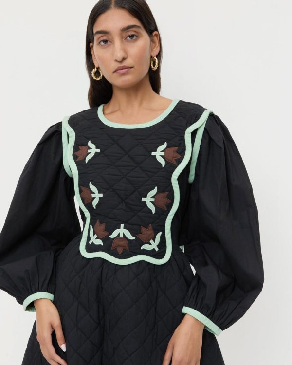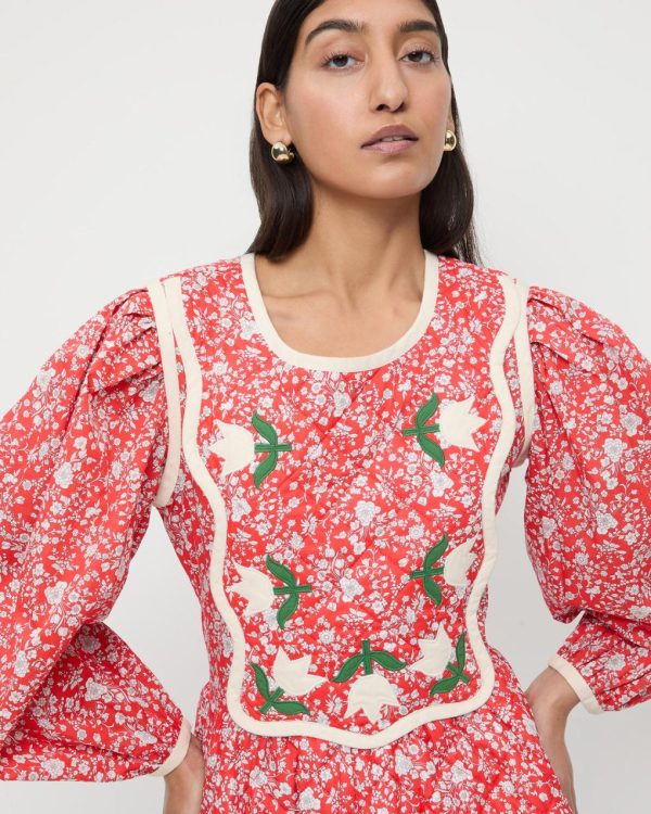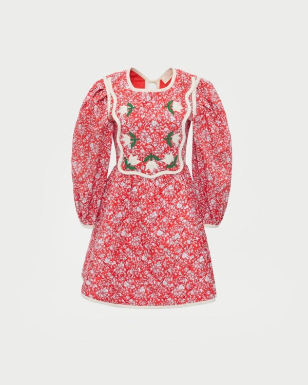 Mini dress in red rosette floral cotton. Features a quilted texture, back ties and elastic along the back of the waist for a secure fit, a wavy yoke detail with delicate contrast trim, and delicate appliqué floral details.