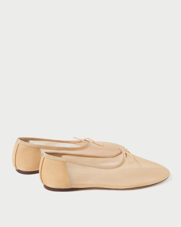 Soft ballet flat in caramel mesh with bow detail. Features a padded leather footbed with gold stamped logo and an almond toe.