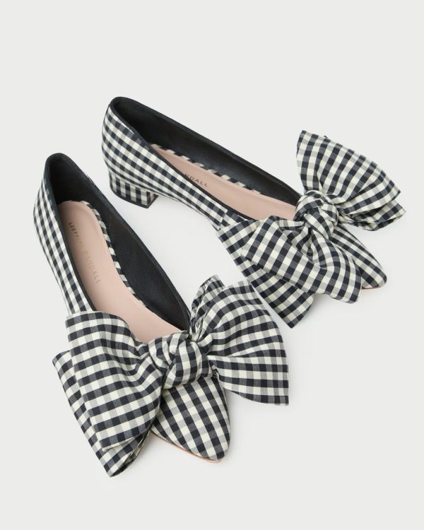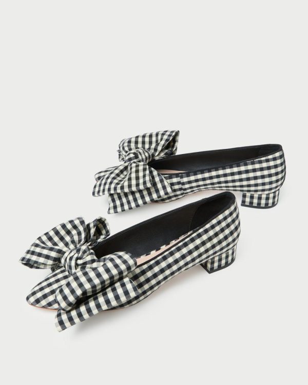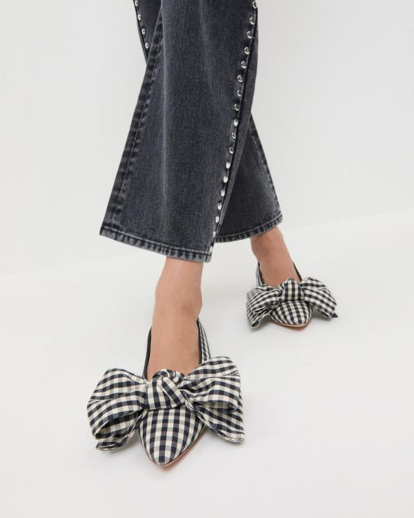 Closed-toe flat with bow detail in black and white gingham cotton-silk fabric. Features a pointed toe and a padded footbed with gold stamped logo.