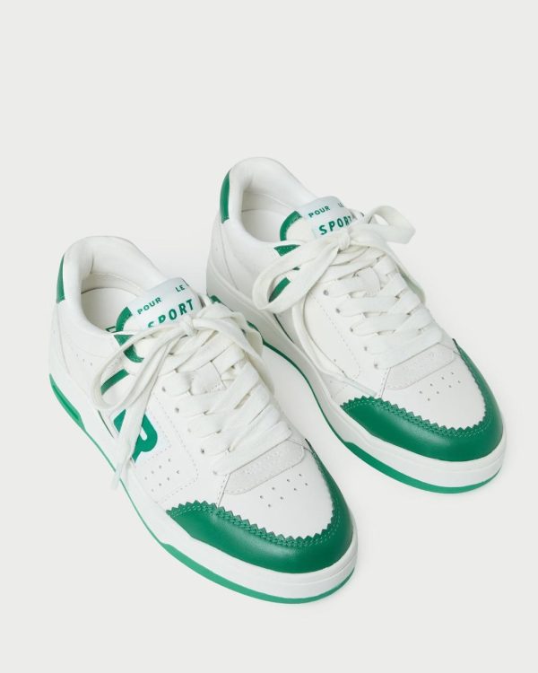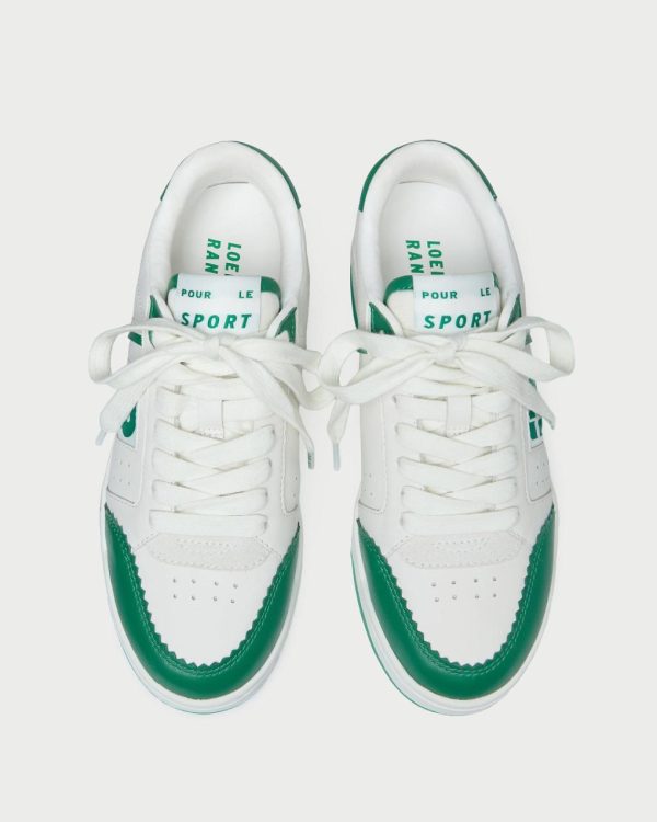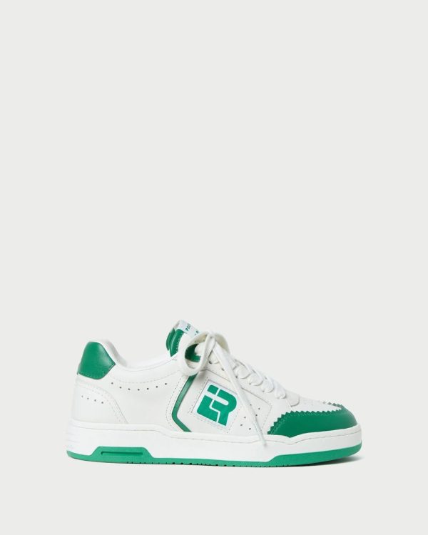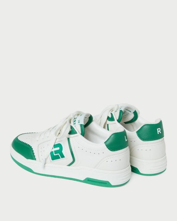 Low-top sneaker in cream and green leather. Features our exclusive LR sport logo branding, green accent detailing at the toe cap, heel notch and sole, an internal heel wedge, and a rubber sole. Made for the casual wearer.