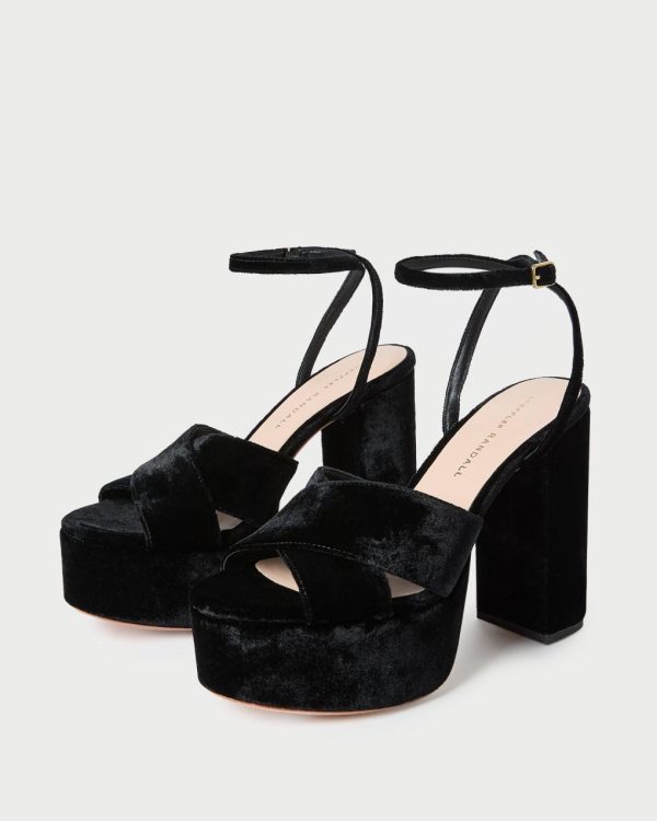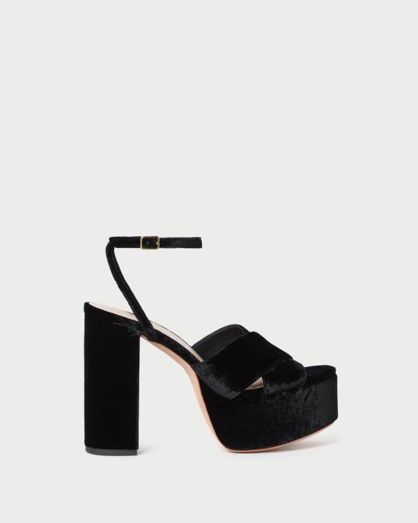 High-heeled platform sandal in black velvet with a banded upper. Features a padded leather footbed with gold stamped logo, an open toe, and an adjustable buckle ankle strap. 5-inch heel, 1.5-inch platform.