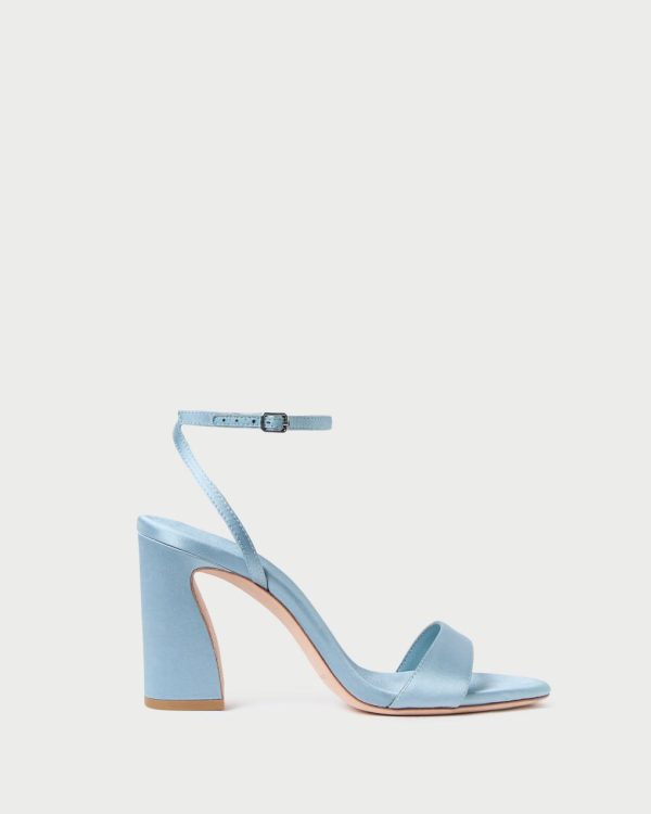 High, curved-heel sandal in blue Italian satin. Features a single-band toe strap, an open toe, adjustable ankle strap, and a padded footbed with a gold-stamped logo. 3.5-inch heel.