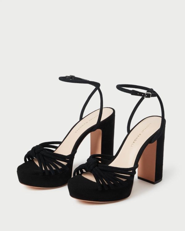 Knotted, heeled platform sandal in black suede with a pieced mignon strap. Features a padded leather footbed with gold stamped logo, an open toe, and an adjustable buckle ankle strap. 5-inch heel, 1.5-inch platform.