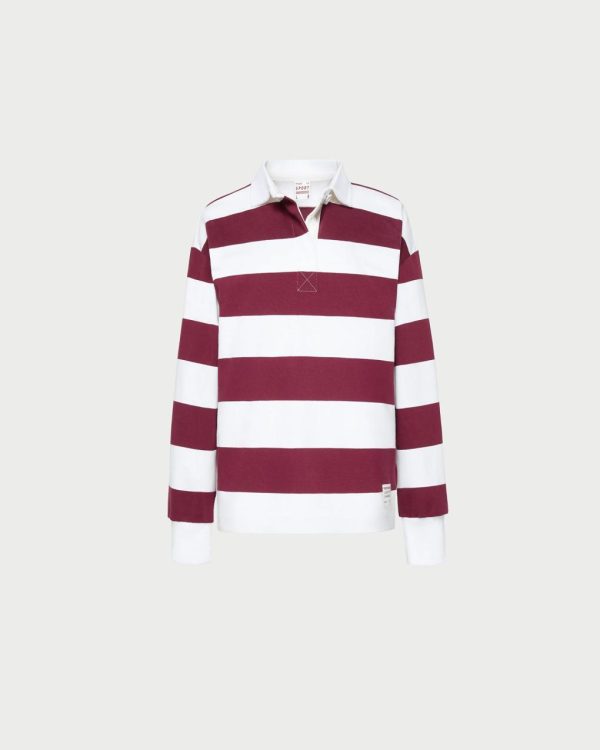 Rugby shirt in maroon and white striped heavyweight cotton. Features a contrast collar, a front placket with hidden buttons, ribbed cuffs and an exterior cotton patch with our exclusive LR Sport logo. Designed for a relaxed, roomy fit.