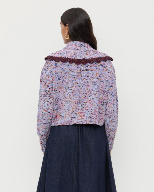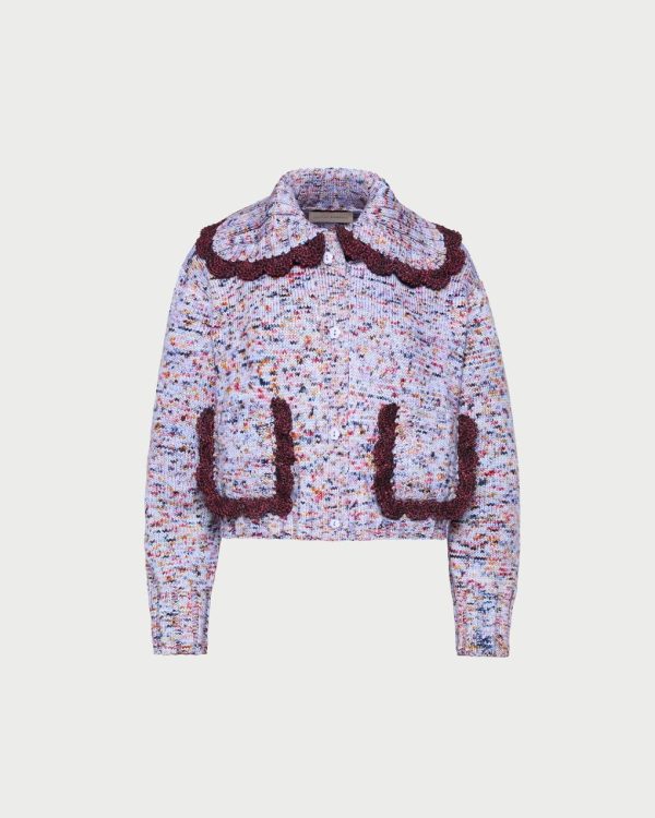 Cardigan sweater in marbled maroon wool. Features two front patch pockets, a wide-knit, removable collar, and a tonal crocheted trim.