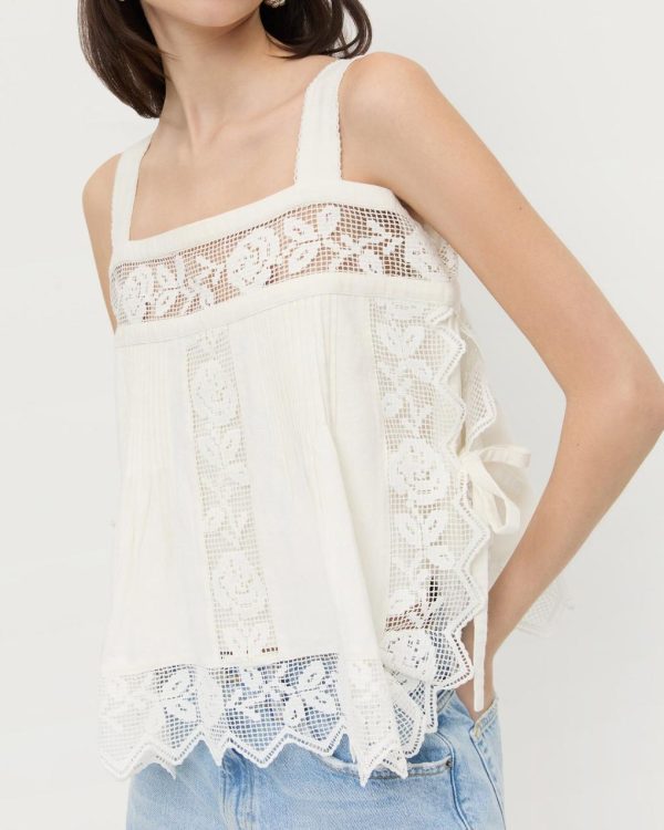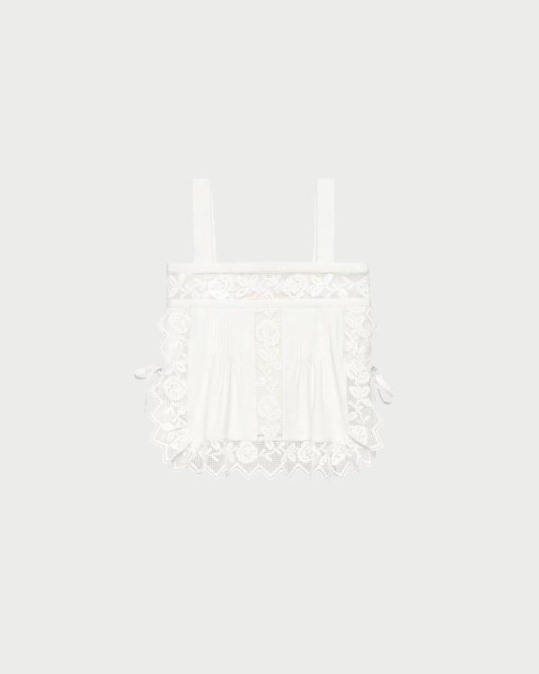 Sleeveless top in white cotton. Features a custom floral grid lace trim, pintuck details, and self ties at the waist.